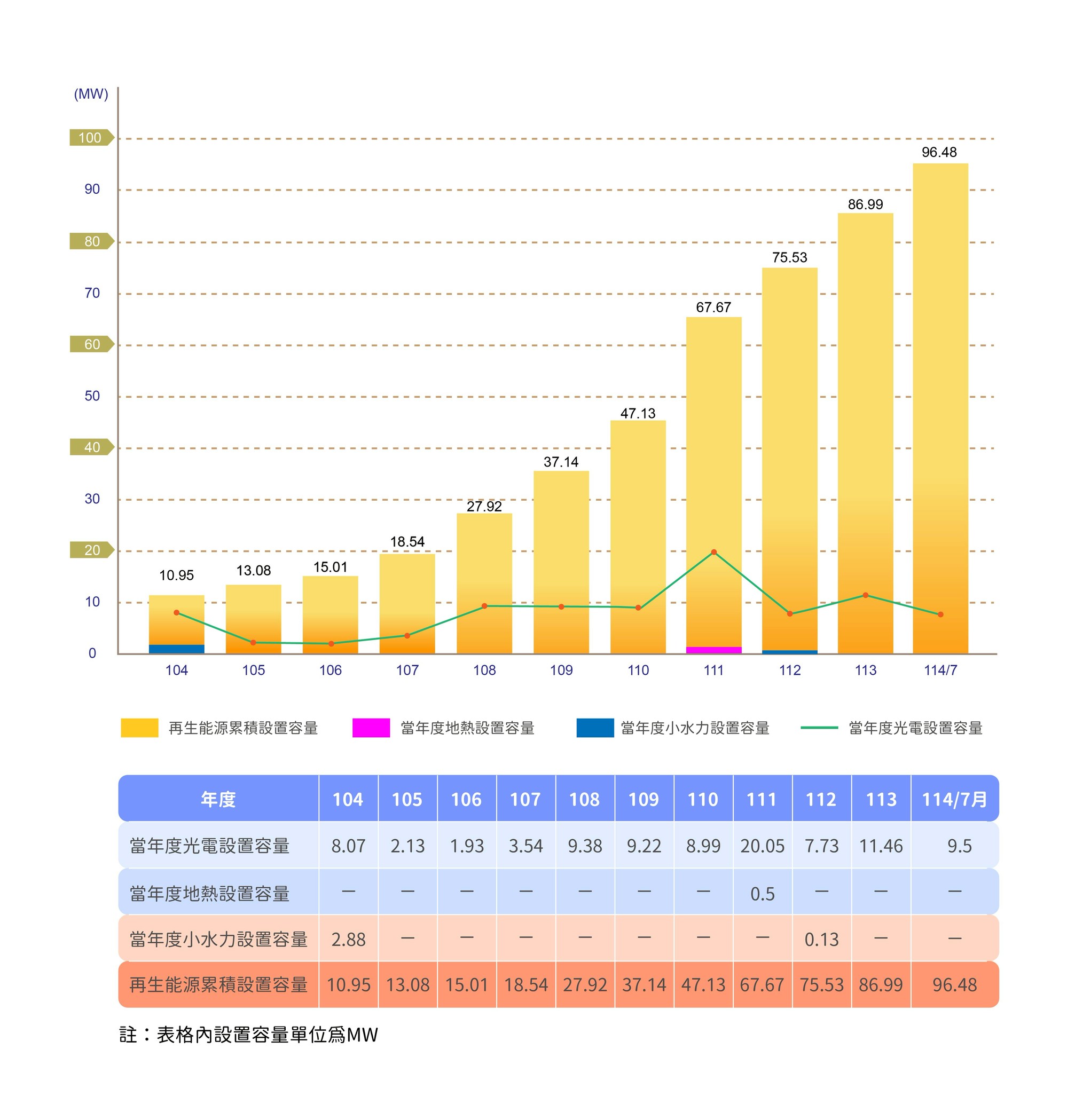 台東縣近年來配合中央綠能政策,截至114年7月止累積再生能源設置容量96,482.105kW,水力發電為4,010kW,地熱發電為499kW太陽光電為91.973.105kW,其中屋頂型太陽光電為67,288.53kW,地面型太陽光電為24,684.575kW。