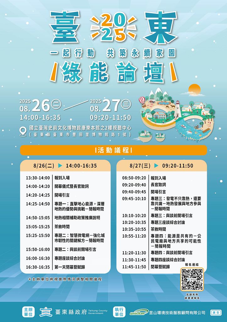 隨著全球邁向淨零碳排與能源轉型的時代浪潮,綠色能源已不再只是科技議題,而是攸關城市韌性與永續發展的關鍵戰略。臺東縣政府將於8月26及27日,在國立臺灣史前文化博物館康樂本館2樓視聽中心舉辦「2025臺東綠能論壇」,廣邀國內外產官學研專家齊聚一堂,從技術、政策到社會參與,全面探討再生能源與地方發展的結合,期望引領臺東縣走向低碳、共榮的新未來。